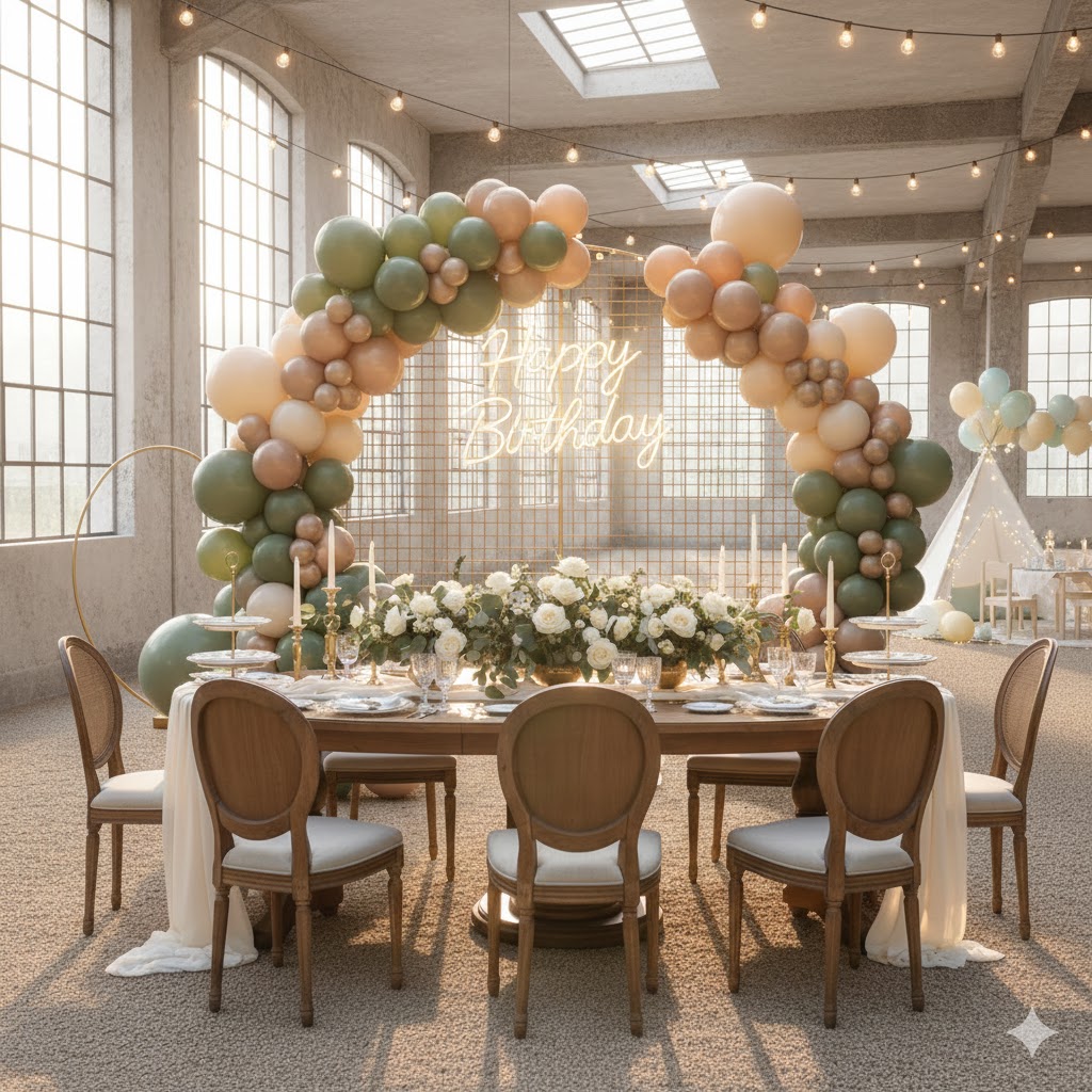 Inklusive: Großes Backdrop, XXL-Ballongirlande, Deko für 4–6 Tische, zusätzliche LED-Lichtelemente, sowie Auf- und Abbau.
