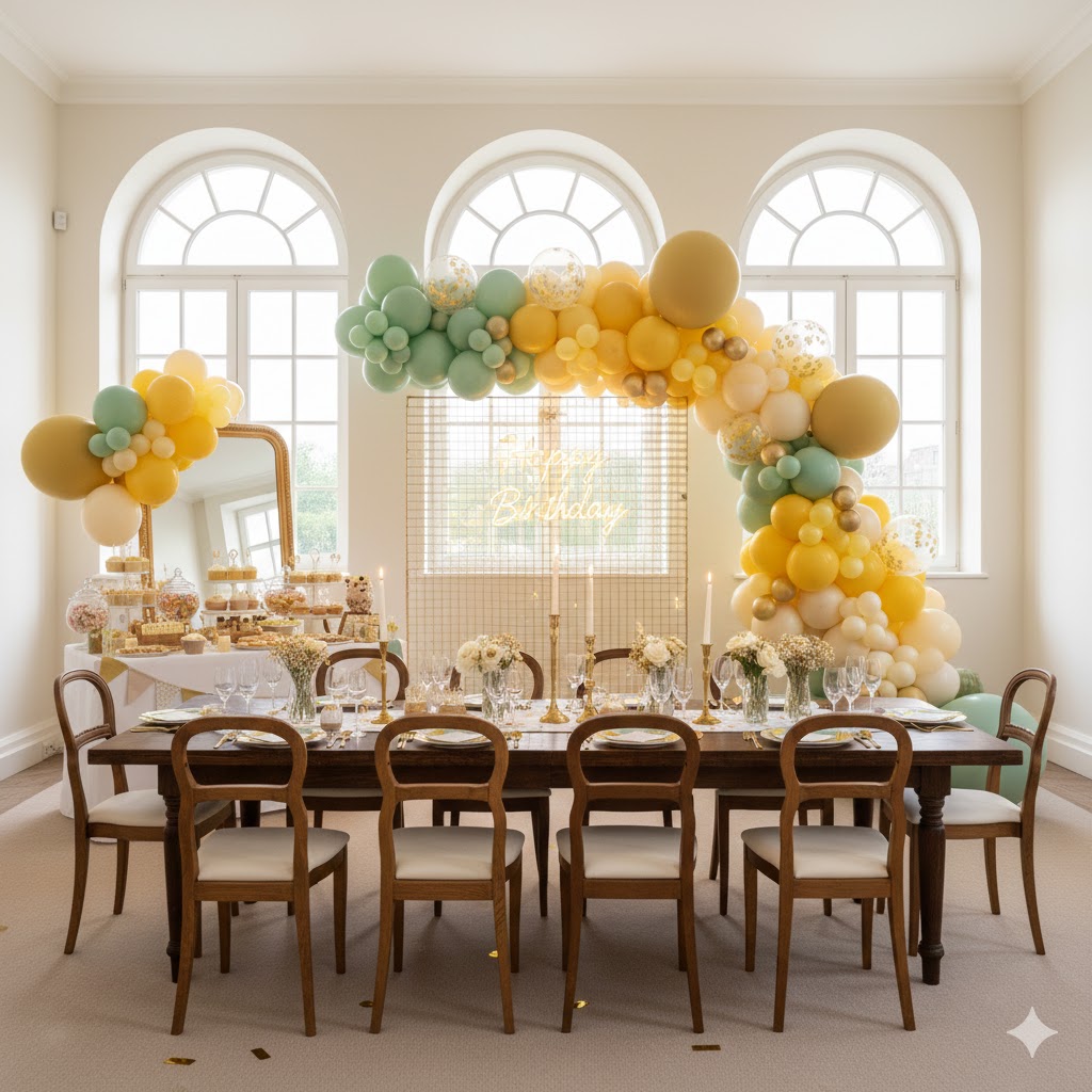 Highlight: Eine riesige Kulisse mit thematischen Accessoires (z.B. Ritterburg, Regenbogen) und eine extra Fotoecke zum Verkleiden und Spaß haben. Inklusive: Großes Motto-Backdrop, XXL-Ballongirlande, Deko für Kinder- und Erwachsenentische und thematische Fotoecke.
