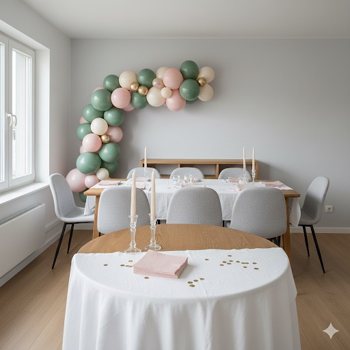 Kleine 2m Ballongirlande, dezente Tischdeko für den Tisch, abgestimmtes Farbkonzept und Welcome-Schild.